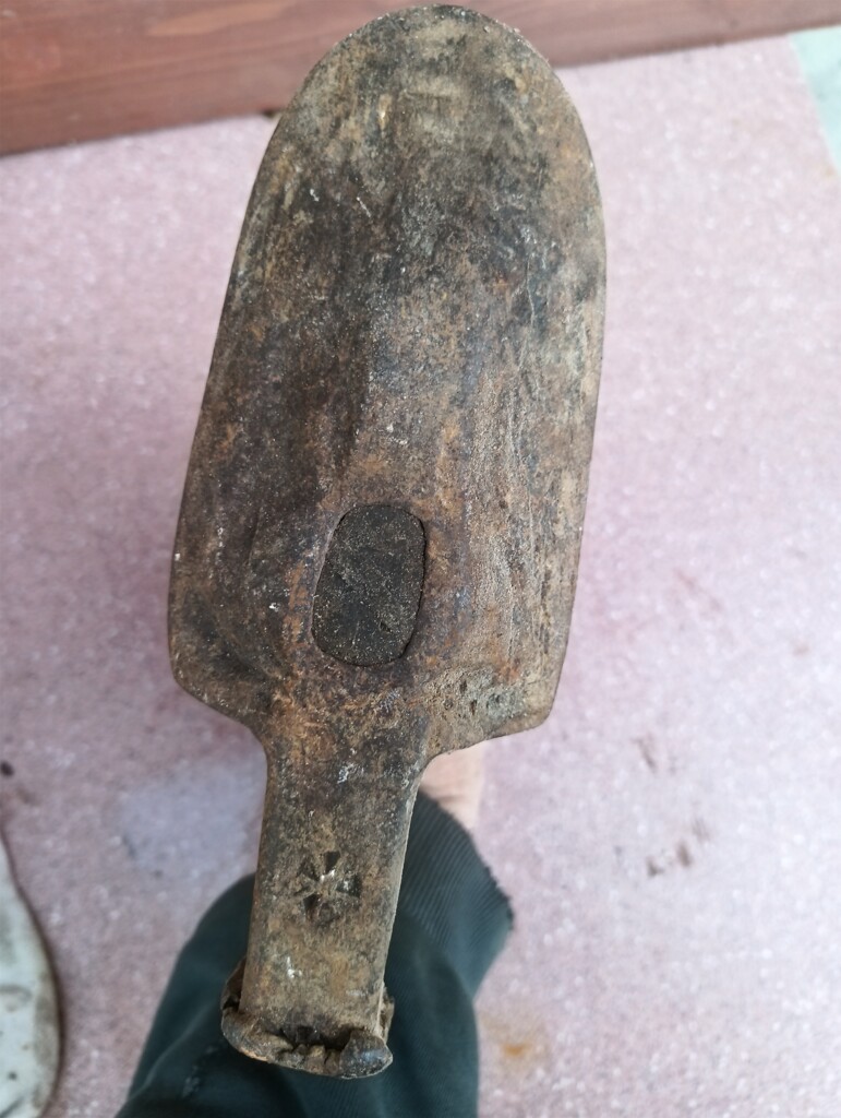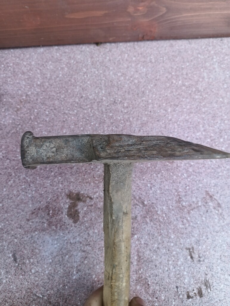 To zploštění vzniklo dlouhodobým mlácením do kamenů. Přehrnutý materiál jsem obrousil. Je to velmi nebezpečné, hrozí zranění od odlétnuvší "střepiny". Stalo se mi to u majzlu, bolí to velmi.
